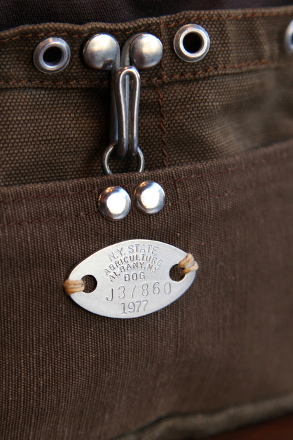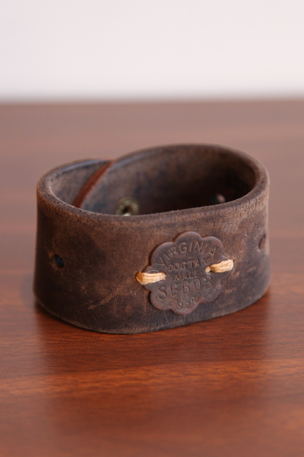 使いこんだ肉厚のレザーに古いプレートを施してとても雰囲気があります。
