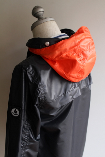 ショールカラーの襟にはオレンジのフードが収納、