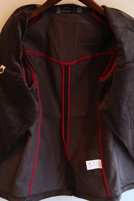 襟裏、ポケットのフラップはチェック生地を施し
